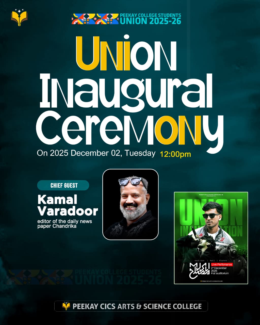 The objectives of the Peekay CICS Students' Union 2024-'25 closely align with the college's vision of excellence and its mission of holistic development. By amplifying student voices and fostering a sense of community, the Union promotes inclusivity, cultural awareness, and social responsibility, reflecting the college’s commitment to a supportive learning environment. Initiatives that encourage skill development and extracurricular participation enhance students' potential for academic and career success, complementing the college’s focus on critical thinking, creativity, and effective communication. Leadership opportunities provided by the Union instill courage, ethical values, and a sense of responsibility, resonating with the mission of integrated development. Additionally, by celebrating the college's heritage and values, the Union ensures the students remain connected to tradition while preparing for a future shaped by ethical practices and innovation. Together, these efforts enrich campus life, fostering an environment where students thrive academically, socially, and personally.