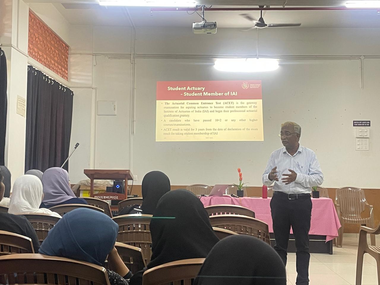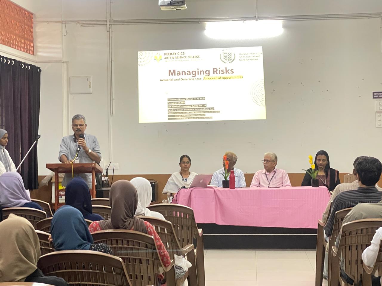 A seminar titled "Managing Risks Through Actuarial and Data Sciences: An Ocean of Opportunities" was successfully conducted on August 4, 2025, by the Department of Statistics. The program commenced with a welcome speech by Ms. Seena A. S., Head of the Department of Statistics. This was followed by the presidential address delivered by the Principal, who emphasized the importance of interdisciplinary studies in contemporary education. Dr. K. Sudheer, Vice Principal, introduced the esteemed guest speaker, Dr. Muhammed Fareed, Chairman, Malabar Institute of Actuarial Science, and former Principal, WMO College, Muttil. Dr. Fareed captivated the audience with his expertise, elaborating on how actuarial science and data science converge to create vast opportunities for managing complex risks. The seminar concluded with a vote of thanks proposed by Ms. Bindu Bhargavi , Assistant Professor.