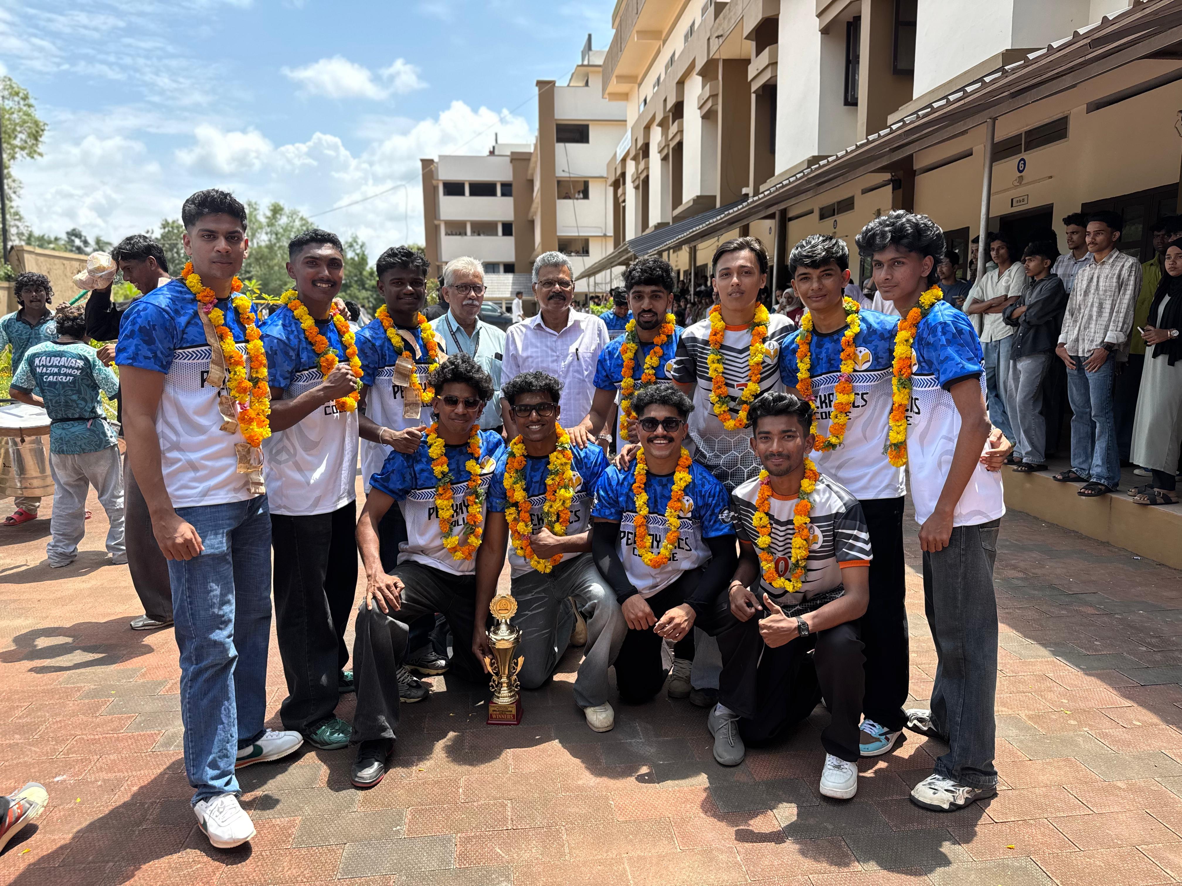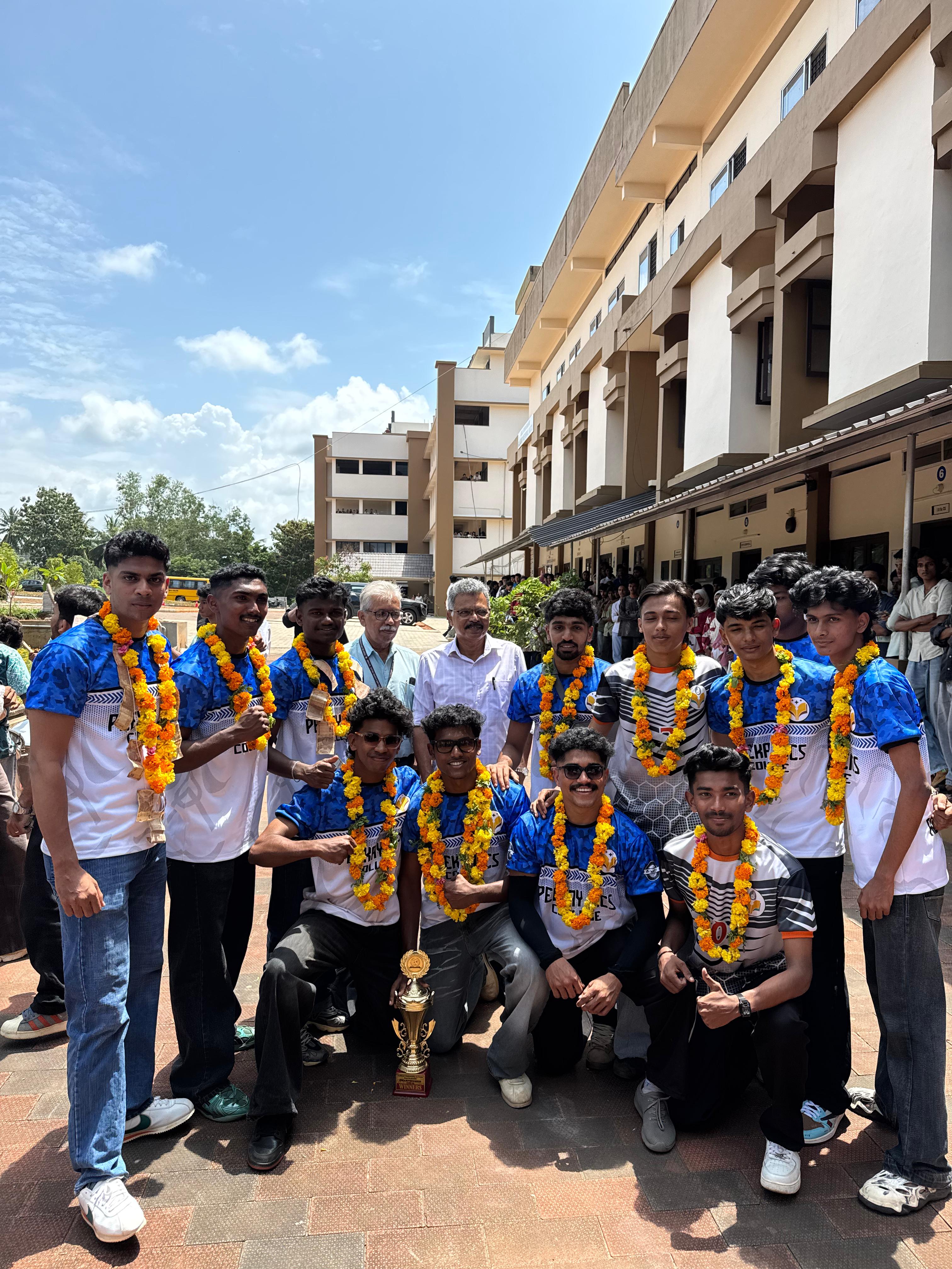 The proud winners of the Vidyut Cup football tournament –’23 held at Amrita Vishwa Vidyapeetham, Amrithapuri Campus. The Peekay college team of players emerged as winners, defeating the home team scoring 2-0.The team with their coach and the winning team being welcomed at the railway station by the IQAC Coordinator.