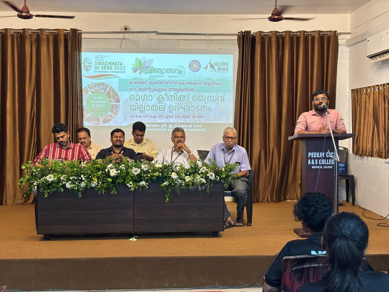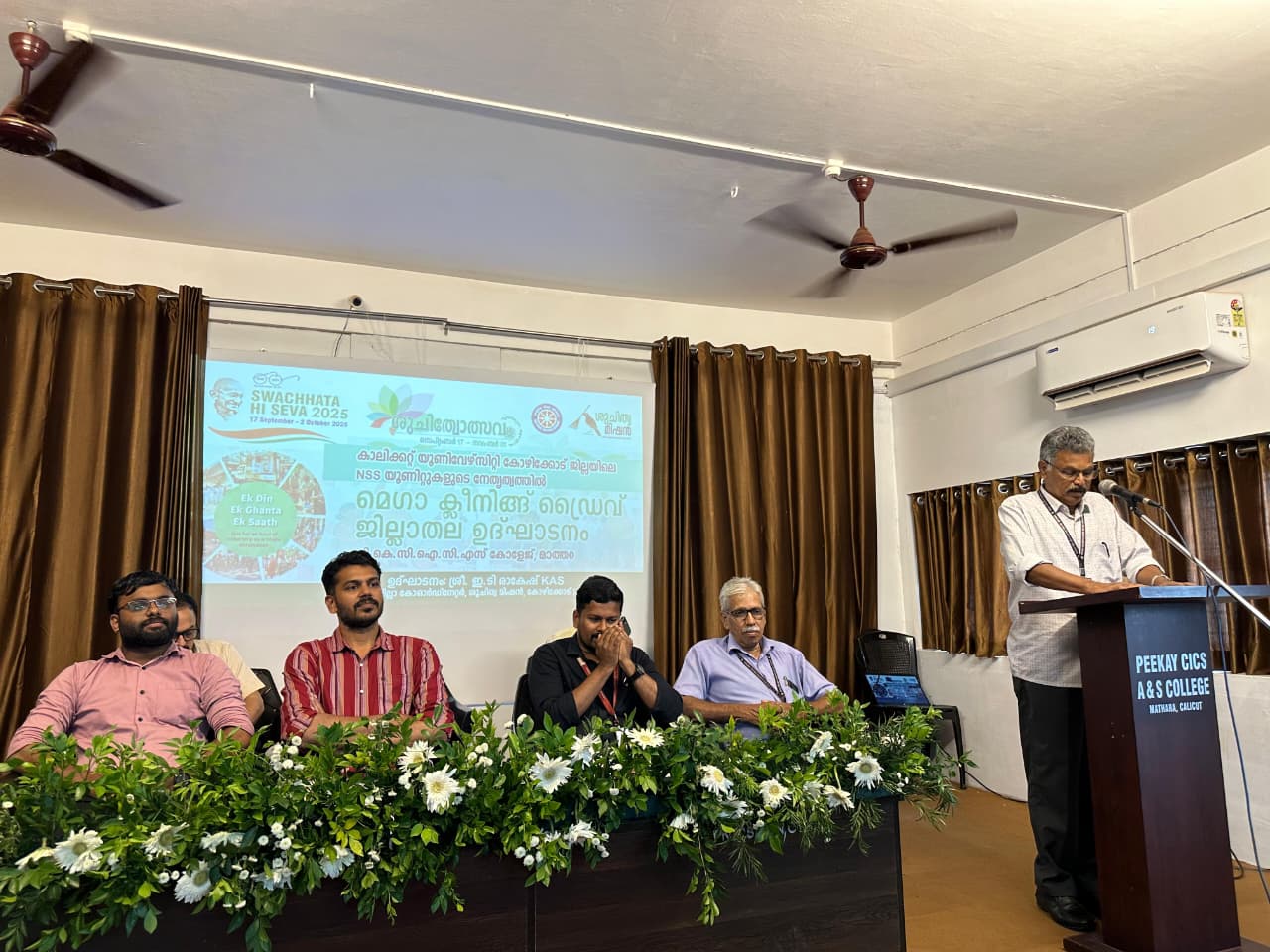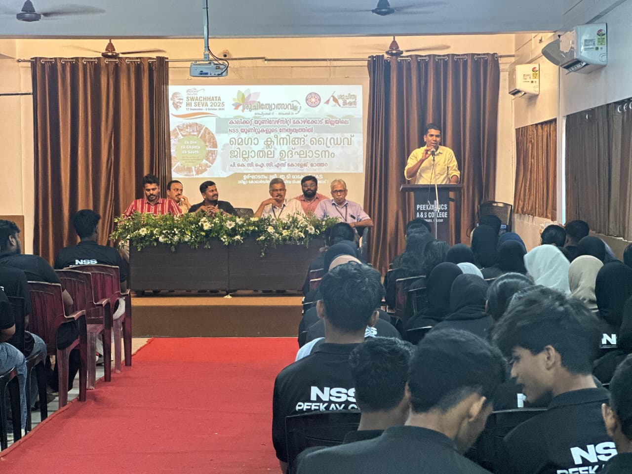 Mathara, Sept 25: The district-level inauguration of the NSS Mass Cleaning Drive was held at Peekay CICS Arts and Science College, Mathara, on Thursday. The programme was inaugurated by Mr. E T Rakesh KAS (District Coordinator, Shujithwa Mission). In his inaugural address, he highlighted the significance of cleanliness campaigns and the need for active youth participation in building a sustainable future. Prof. A Kuttialikutty (Principal) delivered the presidential address, stressing the importance of the NSS motto “Not Me, But You”. The event began with a welcome speech by Mr. Faseel Ahammed (District Coordinator, NSS Kozhikode), followed by a project briefing by Mr. Sarith (Assistant Coordinator, Shujithwa Mission). Dr. K Sudheer and Dr. APM Mohammed Rafeeq offered felicitations. The programme concluded with a vote of thanks by Mr. Muhammed Murshid T (NSS Programme Officer, Peekay CICS College).