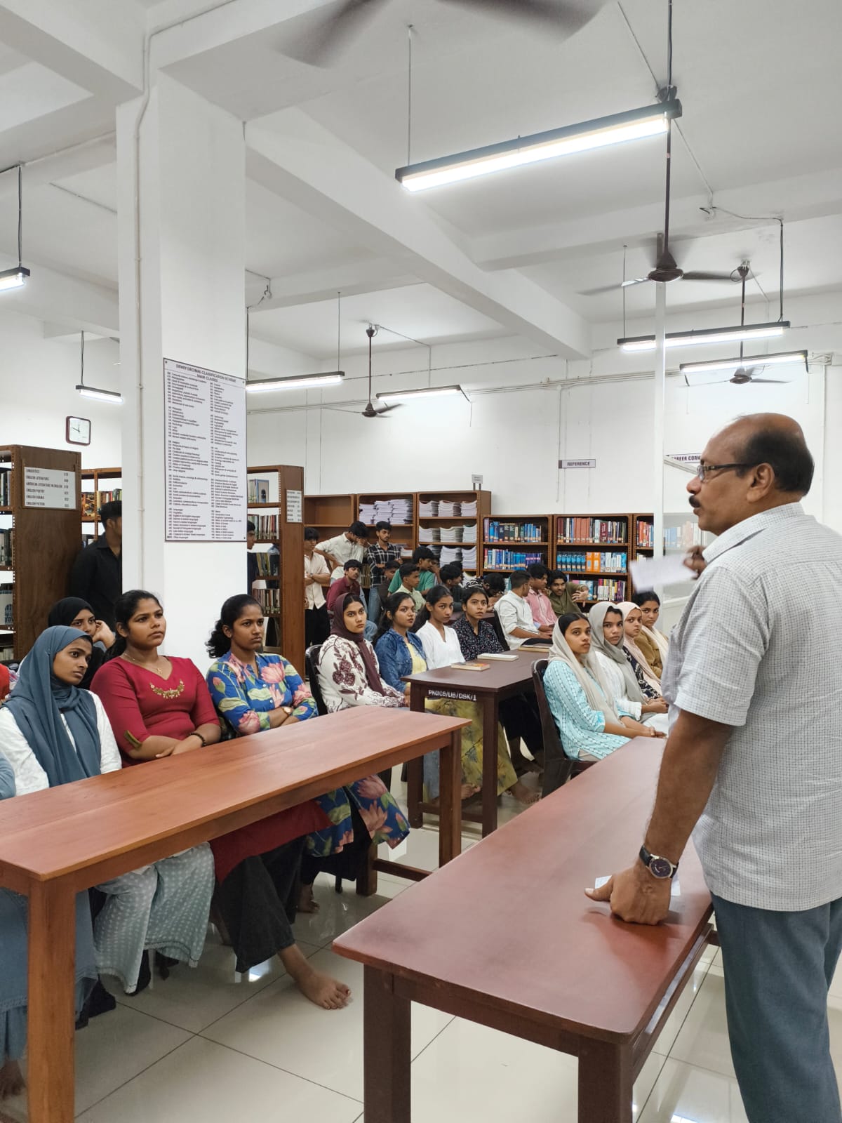 The Library Orientation for first-year UG students was conducted in two engaging sessions, aiming to familiarise them with the facilities, resources, and functioning of the college library. The first session featured an informative PowerPoint presentation highlighting the library’s services, rules, and procedures. Students were introduced to the various sections, borrowing system, digital resources, and research support facilities, ensuring they understood how to make the most of the library’s offerings. The second session comprised a guided tour of the college library, led by the Librarian, Mr. Jayakrishnan. A detailed explanation of each section, including reference materials, journals, digital access points, and reading spaces. The programme not only acquainted students with the physical layout and rules of the library but also inspired them to explore it as a hub of knowledge and learning.