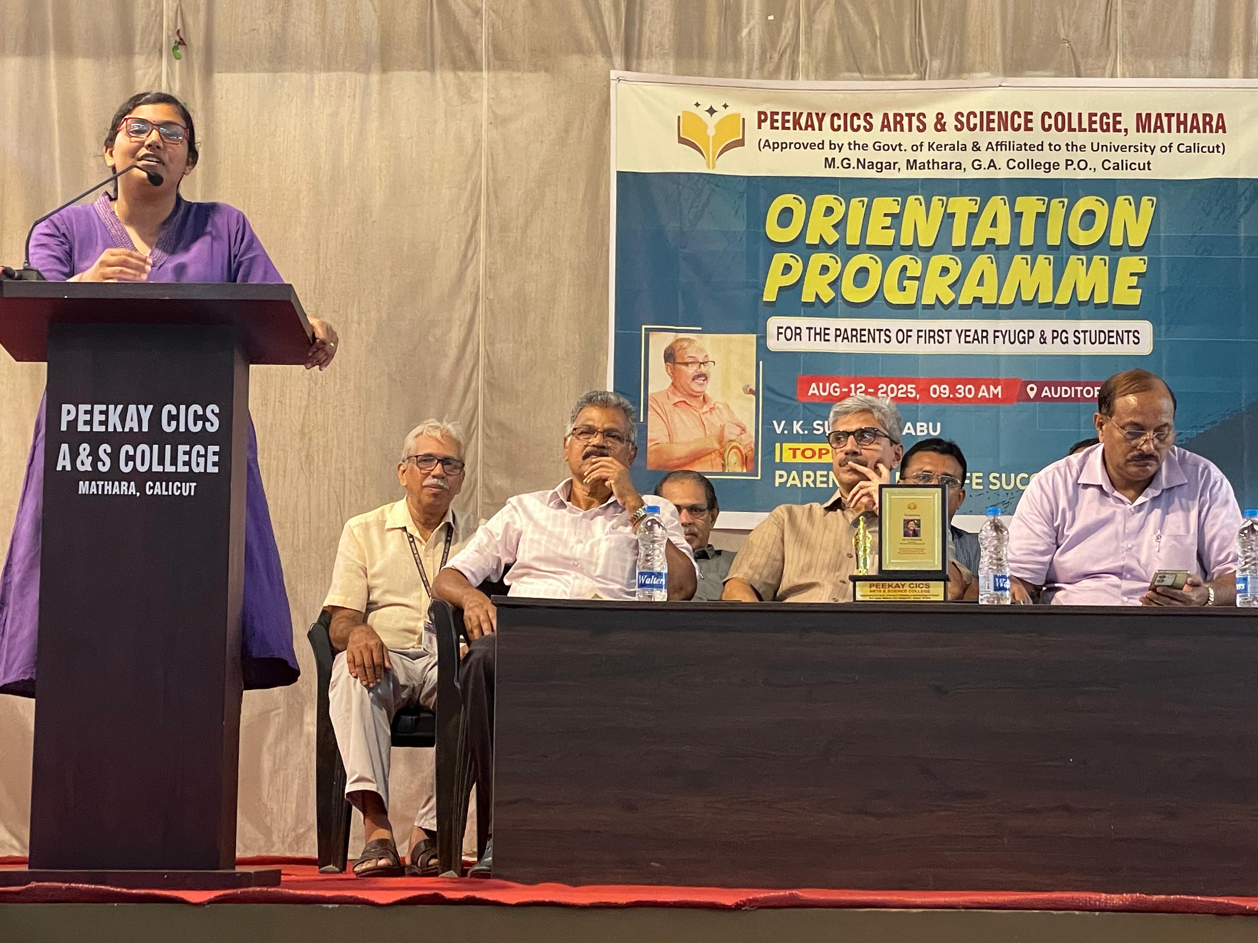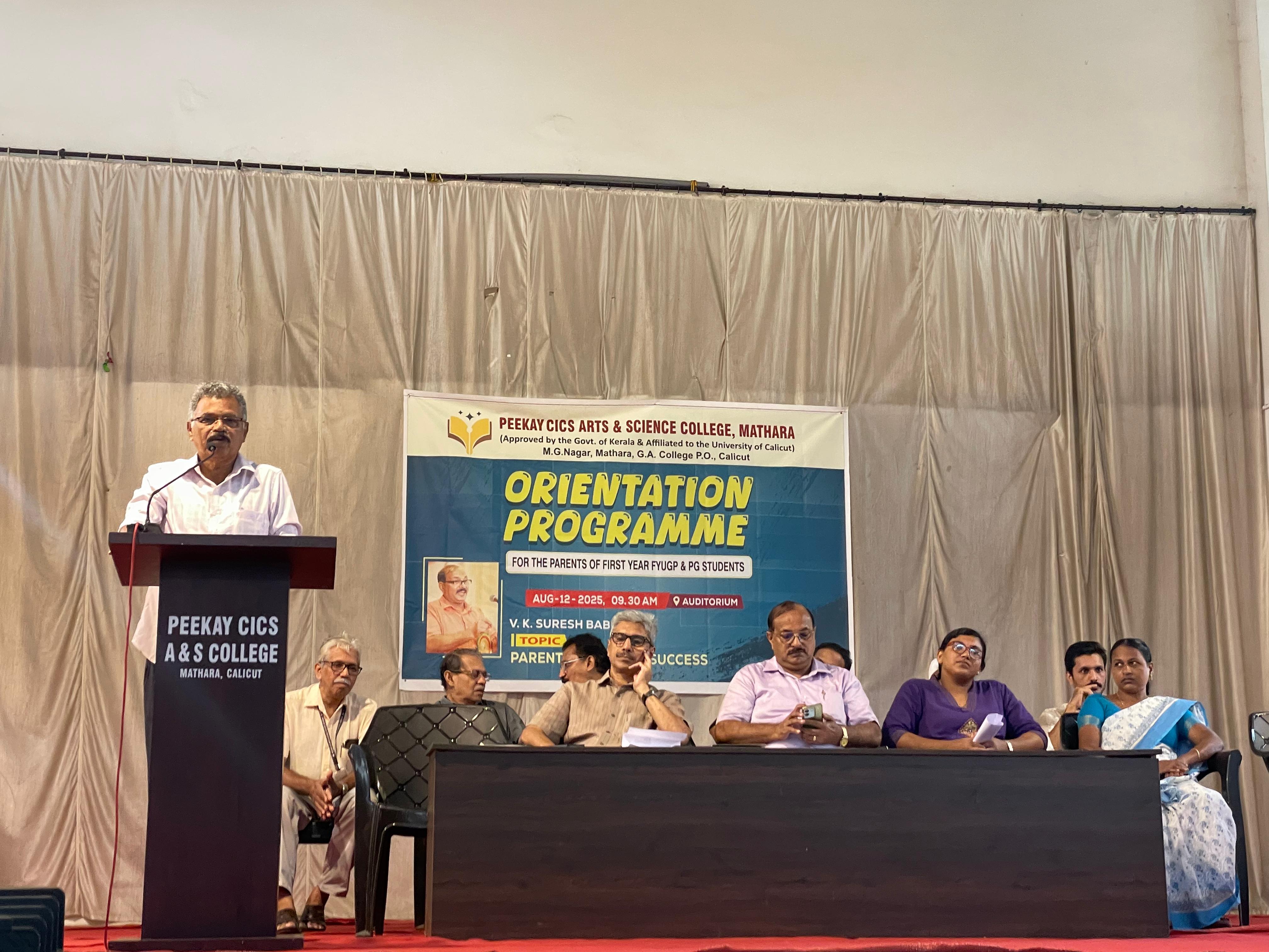 The FYUGP (Four Year Undergraduate Programme) Orientation for the newly admitted first-year students was held with great enthusiasm and academic spirit. The programme was organized to familiarize the students with the structure, objectives, and opportunities of the new undergraduate curriculum, and to motivate them at the very outset of their higher education journey. The orientation session was graced by Dr. Mohammed Saleem, Principal of Farooq Training College and Syndicate Member, University of Calicut, who served as the chief resource person. In his detailed session, Dr. Saleem highlighted the vision and framework of the FYUGP, emphasizing its holistic approach towards academic excellence, skill development, and value-based learning. He encouraged the students to make use of the flexibility and wide learning opportunities offered by the programme and urged them to cultivate critical thinking, creativity, and social responsibility throughout their college life. The programme began with a presidential address by Prof. A. Kuttialikutty, Principal of Peekay CICS College. The session concluded with a Vote of Thanks delivered by Mr. Muhammed Farzin, a first-year Psychology student, who expressed gratitude on behalf of all the freshers.