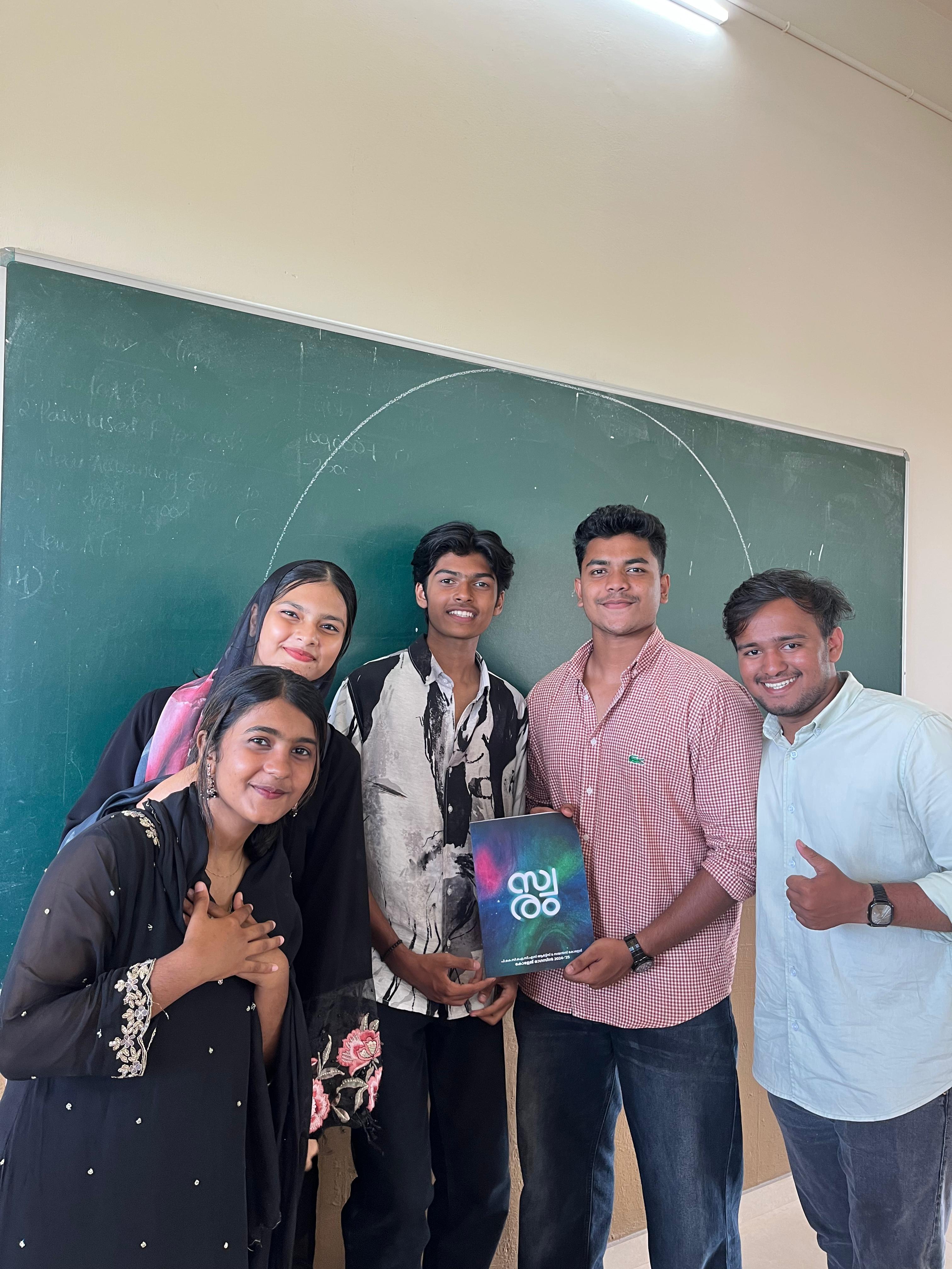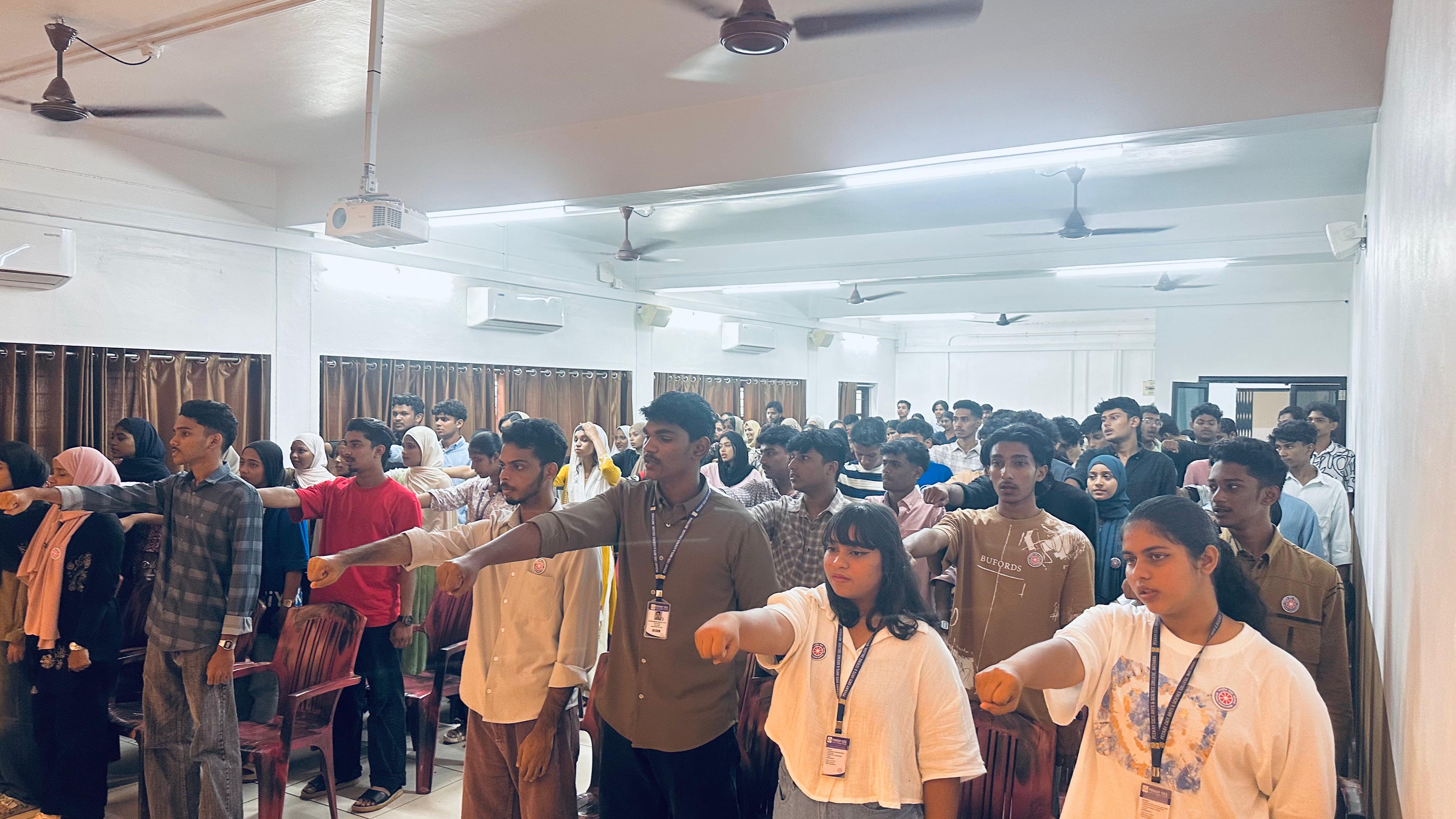 The oath-taking ceremony of the newly elected members of the College Union was held on November 16th at Chola. The Principal administered the oath in the presence of both staff and students. The elected union members are as follows. Chairperson: Aysha Raseena P.P,Vice Chairperson:Sneha, Secretary: Nishal, Joint Secretary: Anena, Fine Arts Representative: Rabea, General Captain: Siyad, UUC1:ShehinHalbith, UUC 2: Rudraksh, Magazine Editor: Delna Fawaz. Additionally, the Association Secretaries for various departments are: Lamisha (Psychology ), Nafla(Commerce), Shamil ( Maths), Shameem (Computer Science), and Thamjeeda (English).The representatives for different academic years are Roshan( first year), Mubariz (second year), Anjana(third year), and Sujaj(PG).