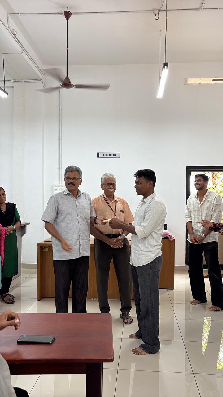 College Library organized an exclusive quiz for first-year students, focusing on January 2026's top current affairs stories on 5th Feb . Thirty students took part in the competitive event.Anan Mohammed of I BCom CA secured the first place, with Binsal from I BCom CA taking second—both winning cash prizes. The awards were presented by Principal Prof. A. Kuttialikutty and Vice Principal Dr. K. Sudheer.