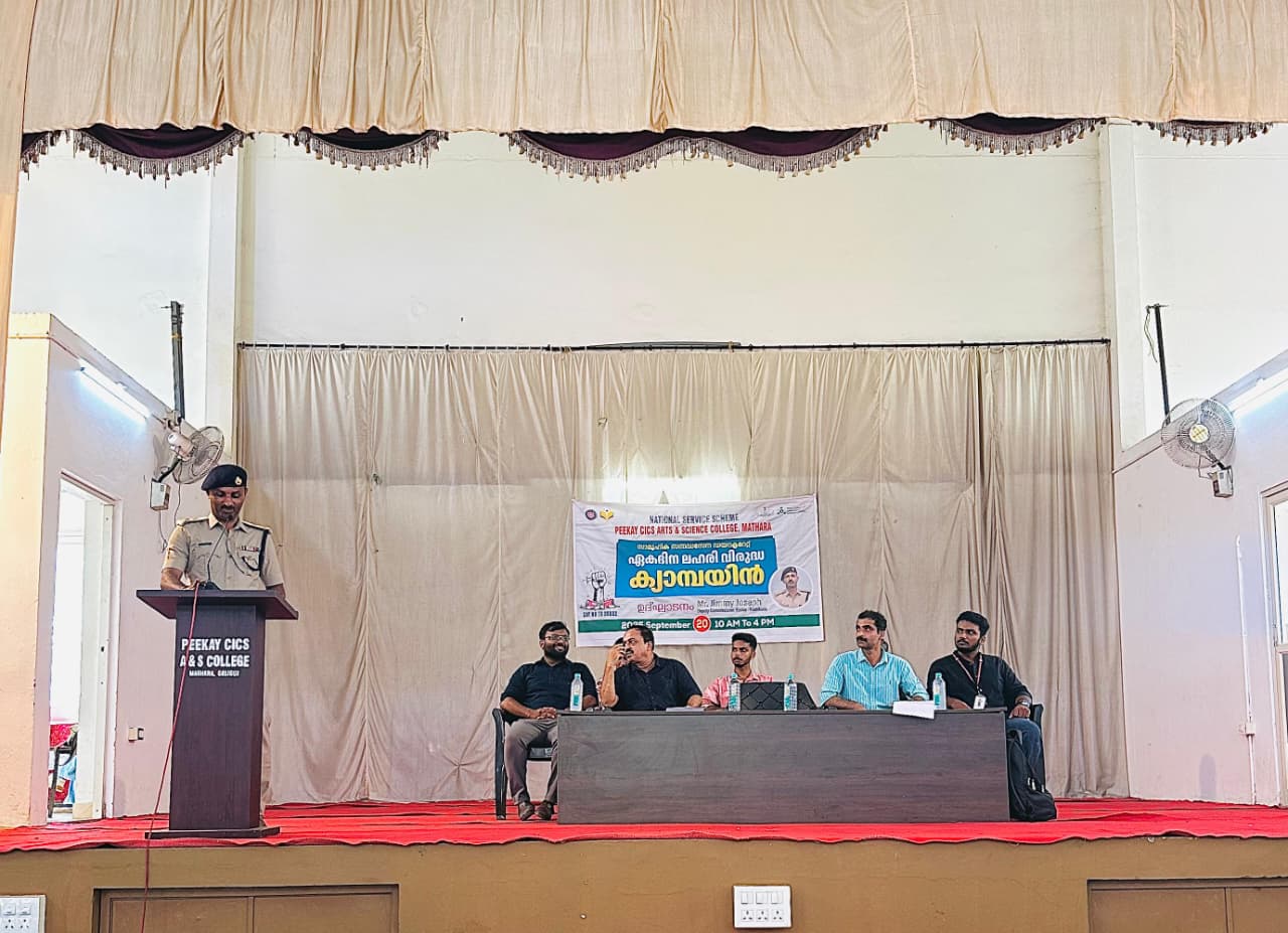The NSS Unit of Peekay CICS Arts and Science College, Mathara, in association with Samoohika Sannadhasena, organised a One-Day Anti-Drug Awareness Campaign on Saturday to spread awareness among students and the public about the ill effects of substance abuse. The programme was inaugurated by Mr. Jimmy Joseph, Assistant Commissioner of Excise, who in his inaugural speech warned about the increasing cases of drug abuse among youth and urged collective efforts to eradicate the menace. The presidential address was delivered by Dr. APM Rafeeq, NAAC Coordinator, who underlined the role of educational institutions in building drug-free campuses. The event was felicitated by Mr. Jithesh, Vimukthi District Coordinator, while Mr. Muhammed Murshid, NSS Programme Officer, extended a warm welcome to the gathering. Ms. Devika, NSS Secretary, proposed the vote of thanks. The first technical session was led by Mr. Jalaludheen, Excise Preventive Officer, who explained the legal aspects and shared real-life case studies. The second session, handled by Mr. Akram, Intern at Samoohika Sannadhasena, focused on peer influence and preventive strategies. As part of the campaign, students took part in a signature wall activity and an Anti-Drug Pledge, reaffirming their commitment to a drug-free life. The campaign concluded with an awareness drive in and around the college campus, where NSS volunteers actively interacted with the public to spread the anti-drug message. The programme received enthusiastic participation from students, faculty members, and the local community, making it a powerful initiative in the fight against drug abuse.